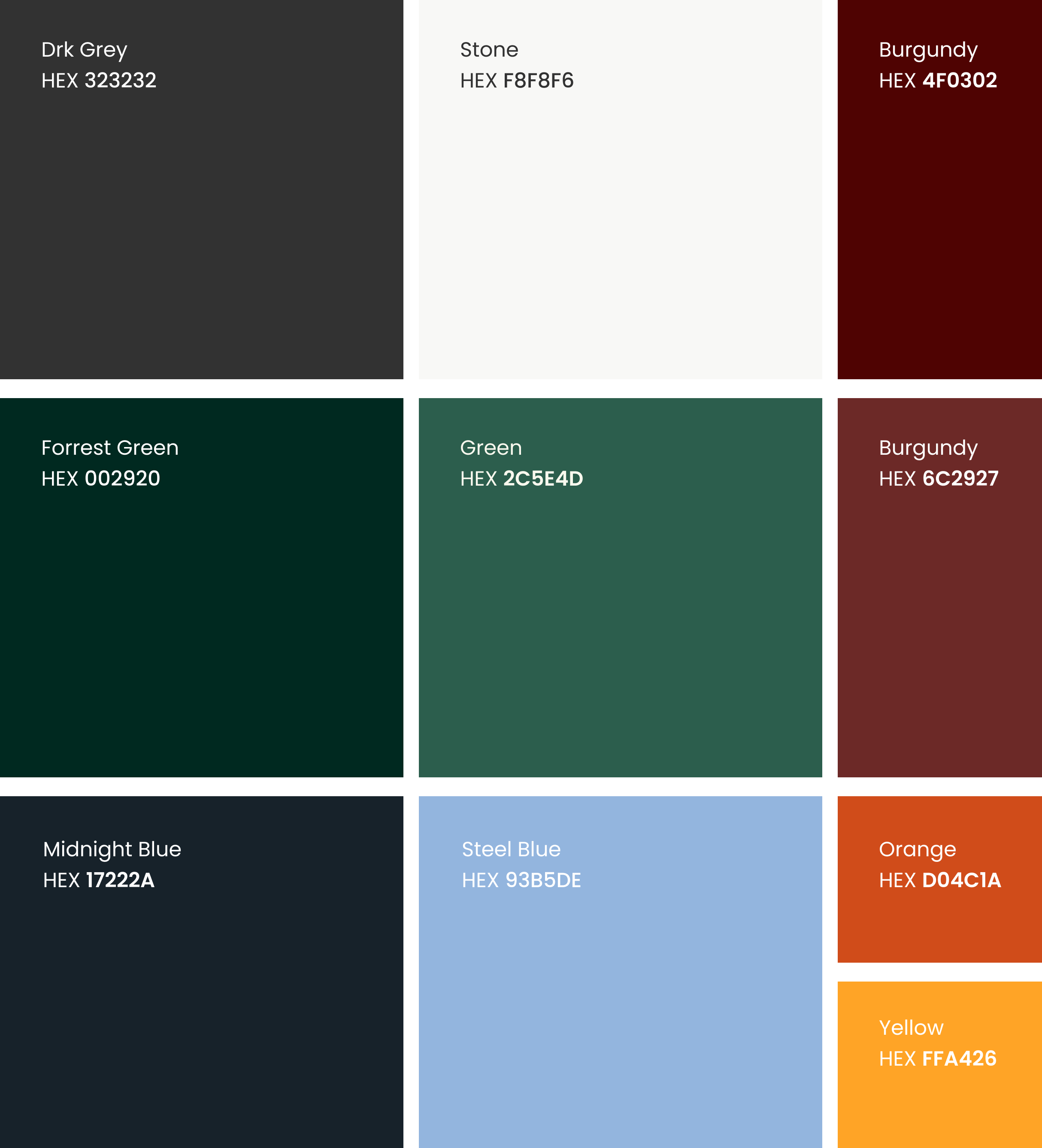 The system is anchored by Forrest Green and Midnight Blue for seriousness and stability. Supporting tones like Stone, Green, and Burgundy introduce depth without tipping into decorative softness.
